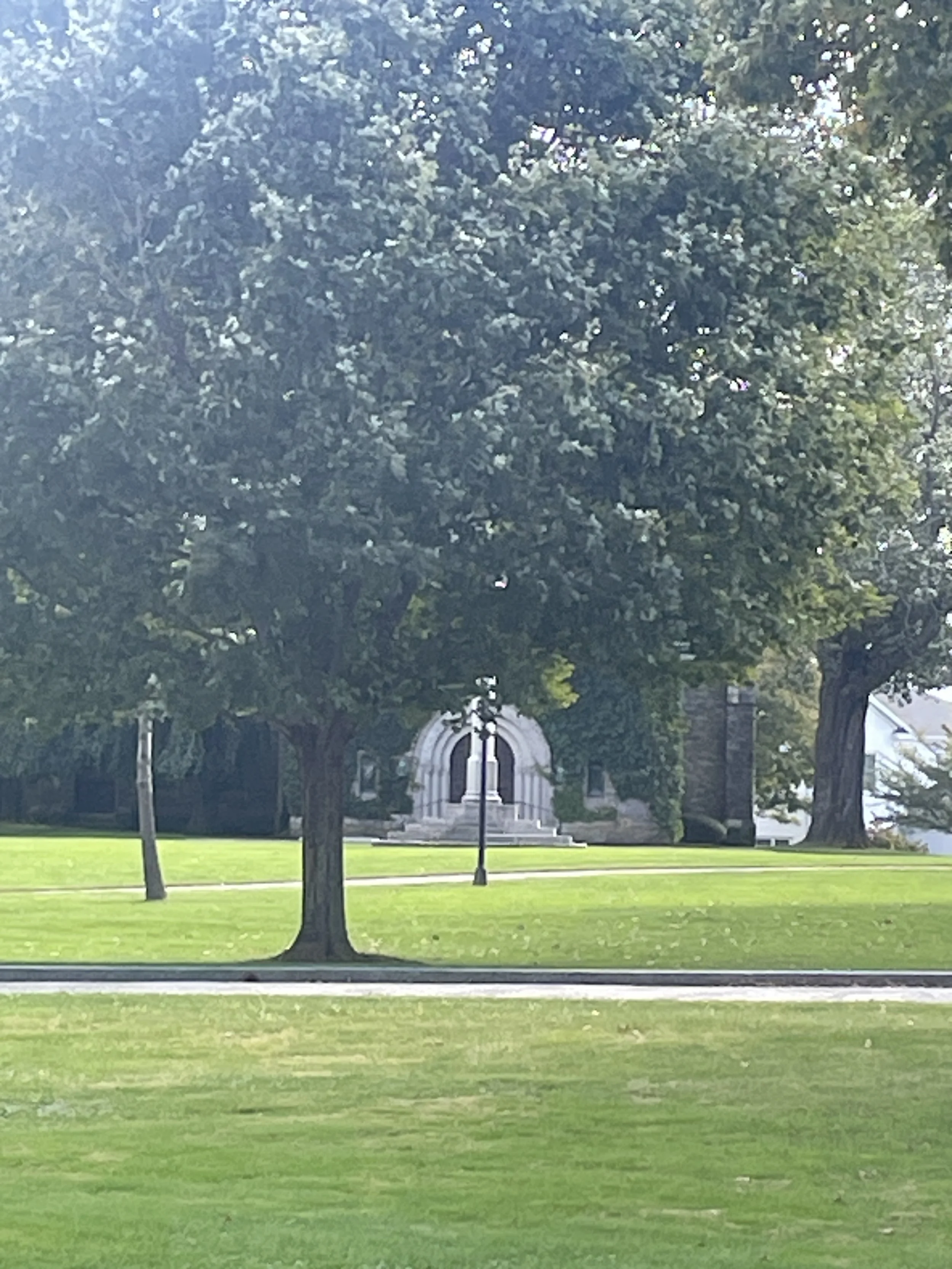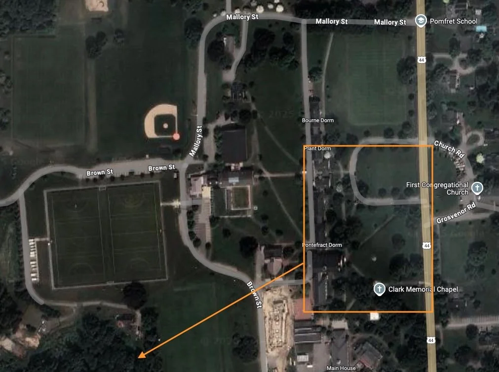 Take a birds-eye view of the Pomfret School campus, focusing on the front lawns. Notice that there is a perfectly straight line connecting the following five objects: